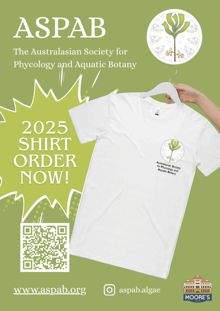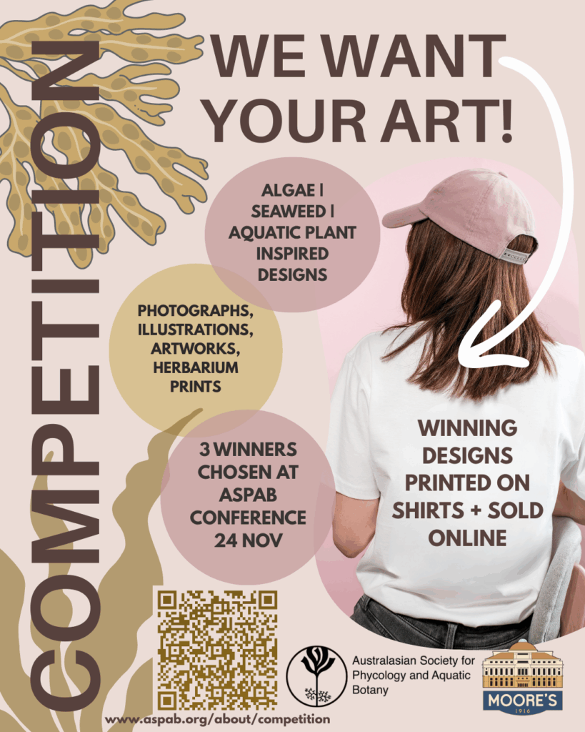 Moore’s Department Store is providing the unique opportunity to submit your favourite algae-inspired designs to be featured on a limited-edition T-shirt collection. Three winning designs will be chosen at the Australasian Society of Phycology and Aquatic Botany (ASPAB) annual conference and $5 from every shirt sold will go directly back to the society to support future activities and student initiatives.